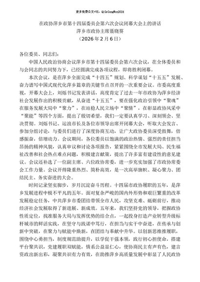 领导讲话:2026215萍乡市政协主席聂晓葵:在政协萍乡市第十四届委员会第六次会议闭幕大会上的讲话