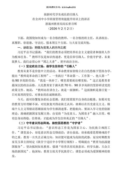 / 领导讲话:2026215恩施州教育局局长曾召辉:在全州中小学班级管理效能提升培训上的讲话