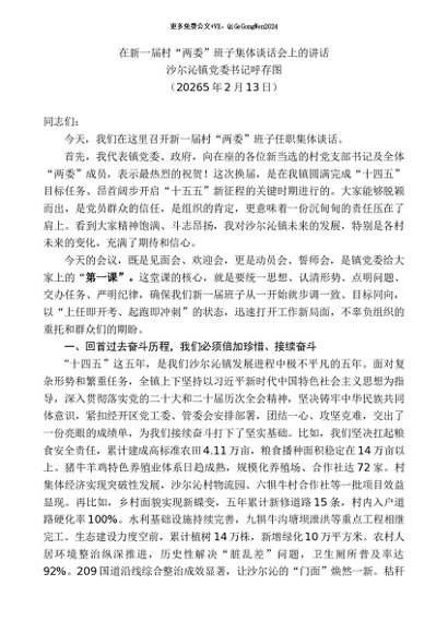 / 领导讲话:2026215沙尔沁镇党委书记呼存图:在新一届村“两委”班子集体谈话会上的讲话