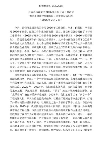 / 领导讲话:20260315太原市政建设集团有限公司董事长郝东辉:在太原市政集团2026年工作会议上的讲话