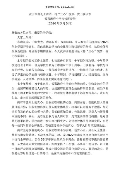/ 领导讲话:20260315长郡湘府中学校长蒋春华:在开学典礼上讲话