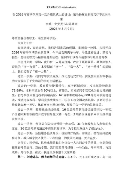 / 领导讲话:20260315宿城一中党委书记陈曙光:在2026年春季学期第一次升旗仪式上的讲话
