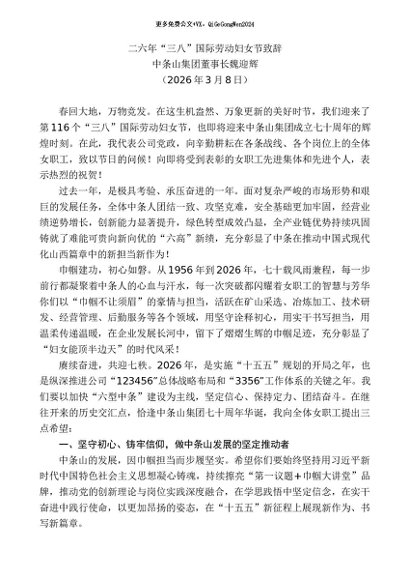 / 领导讲话:20260315中条山集团董事长魏迎辉:二六年“三八”国际劳动妇女节致辞