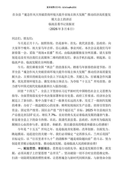 / 领导讲话:20260315张振亚:在全县“观念作风大突破营商环境大提升市场主体大发展”推动经济高质量发展大会上的讲话