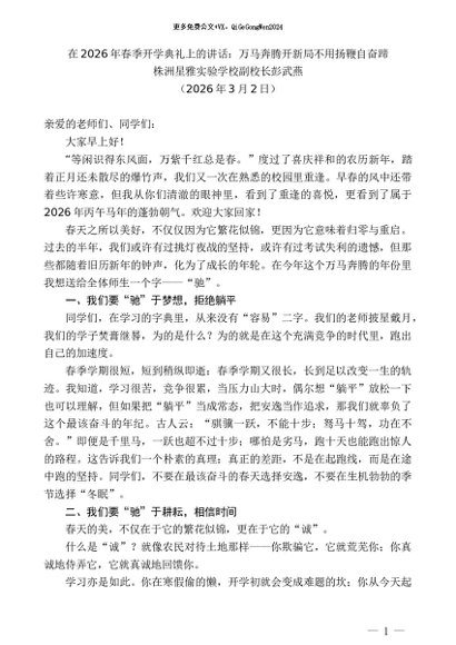 / 领导讲话:20260315株洲星雅实验学校副校长彭武燕:在2026年春季开学典礼上的讲话
