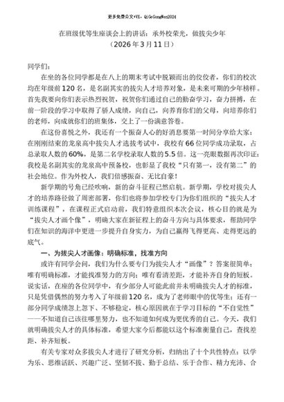 / 领导讲话:20260315在班级优等生座谈会上的讲话