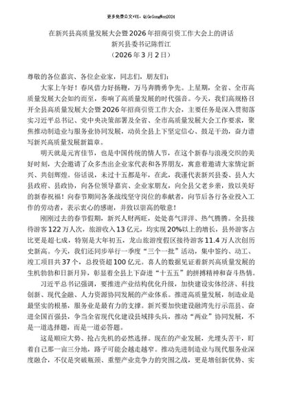 / 领导讲话:20260315新兴县委书记陈哲江:在新兴县高质量发展大会暨2026年招商引资工作大会上的讲话