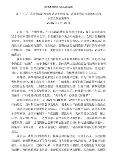 / 领导讲话:20260315女职工代表王琳琳:在“三八”国际劳动妇女节座谈会上的发言