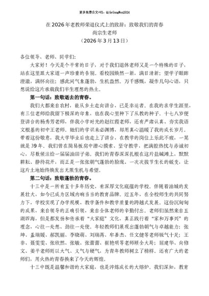 / 领导讲话:20260315尚宗生老师:在2026年老教师荣退仪式上的致辞:致敬我们的青春