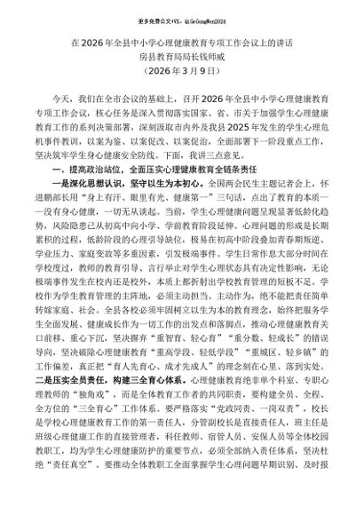 / 领导讲话:20260315房县教育局局长钱师威:在2026年全县中小学心理健康教育专项工作会议上的讲话