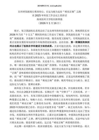 / 领导讲话:2026215海南医科大学校长陈国强:在2025年科技工作会议上的讲话
