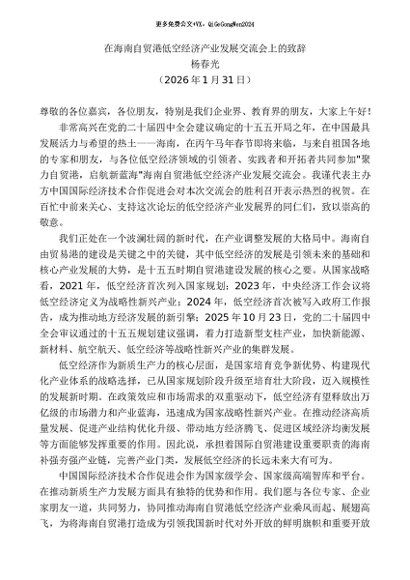 / 领导讲话:2026215杨春光:在海南自贸港低空经济产业发展交流会上的致辞