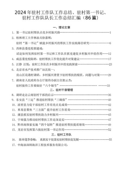 / 2024年度总结∣驻村工作:2024年驻村工作队工作总结、驻村第一书记、驻村工作队队长工作总结汇编(86篇)