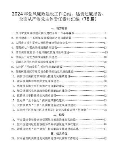 / 2024年度总结∣廉政建设:2024年党风廉政建设工作总结、述责述廉报告、全面从严治党主体责任素材汇编(78篇)