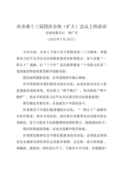 / 党委全会工作报告:20230723在市委十三届四次全体(扩大)会议上的讲话——宝鸡市委书记 杨广亭
