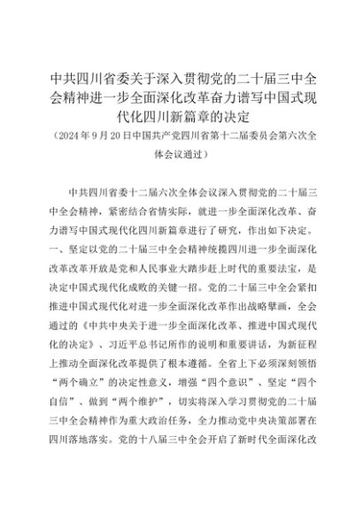党委全会工作报告:20240920中共四川省委关于深入贯彻党的二十届三中全会精神进一步全面深化改革奋力谱写中国式现代化四川新篇章的决定