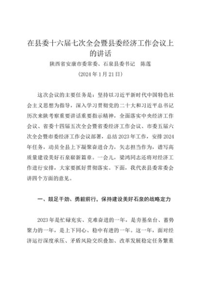 / 党委全会工作报告:20240121在县委十六届七次全会暨县委经济工作会议上的讲话——石泉县委书记