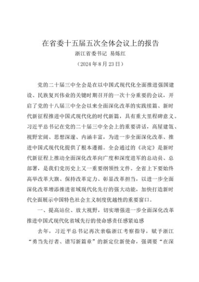 / 党委全会工作报告:20240823在省委十五届五次全体会议上的报告——浙江省委书记 易炼红