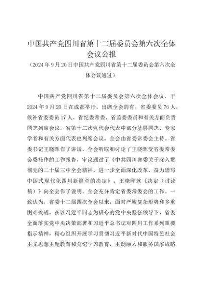 / 党委全会工作报告:20240900中国共产党四川省第十二届委员会第六次全体会议公报