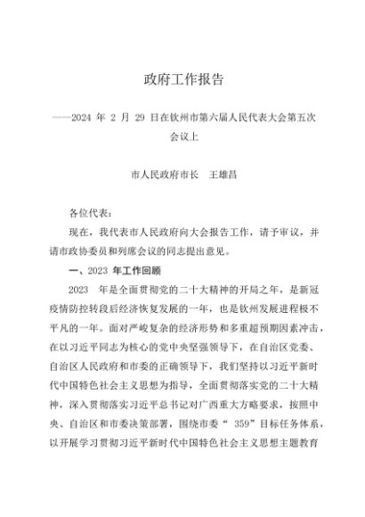 / 政府工作报告:2024年钦州市政府工作报告