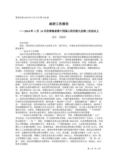 / 政府工作报告:2024年青海省政府工作报告