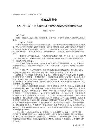 政府工作报告:2024年贵州省政府工作报告