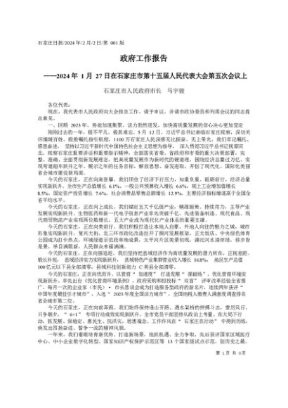 / 政府工作报告:2024年石家庄市政府工作报告