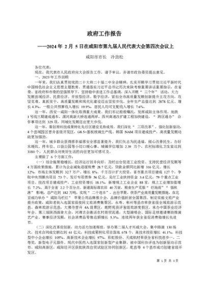 / 政府工作报告:2024年咸阳市政府工作报告