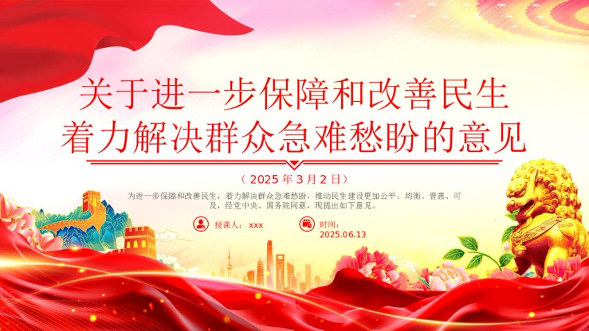 【七哥公文】2025年:【七哥公文】关于进一步保障和改善民生着力解决群众急难愁盼的意见PPT课件+更多免费公文+VX:QiGeGongWen2024+更多免费公文+VX:QiGeGongWen2024