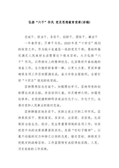 【七哥公文】2025年:【七哥公文】弘扬“六干”作风 党员思想教育党课(讲稿)+更多免费公文+VX:QiGeGongWen2024+更多免费公文+VX:QiGeGongWen2024
