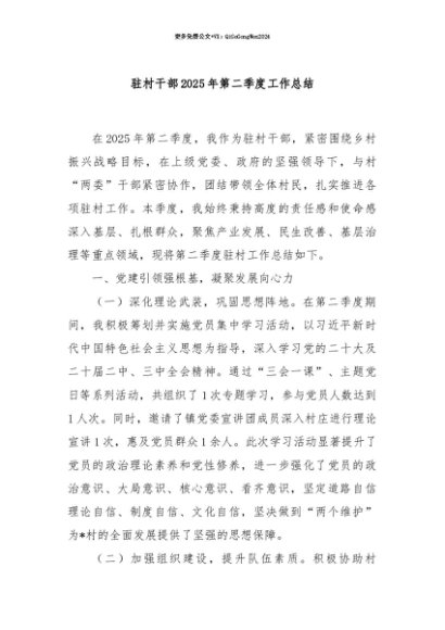 【七哥公文】2025年:【七哥公文】驻村干部2025年第二季度工作总结+更多免费公文+VX:QiGeGongWen2024+更多免费公文+VX:QiGeGongWen2024