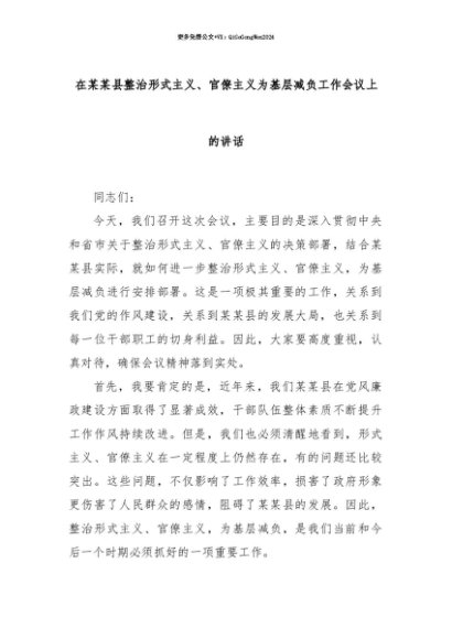 【七哥公文】2025年:【七哥公文】在某某县整治形式主义、官僚主义为基层减负工作会议上的讲话+更多免费公文+VX:QiGeGongWen2024+更多免费公文+VX:QiGeGongWen2024