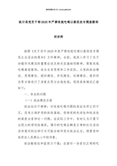 【七哥公文】2025年:【七哥公文】统计局党员干部2025年严禁违规吃喝以案促改专题查摆剖析材料+更多免费公文+VX:QiGeGongWen2024+更多免费公文+VX:QiGeGongWen2024