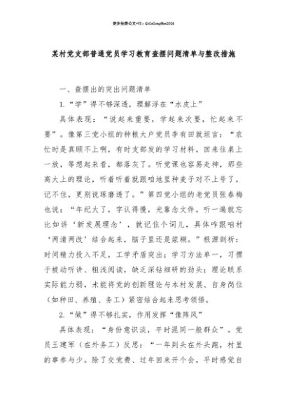 【七哥公文】2025年:【七哥公文】某村党支部普通党员学习教育查摆问题清单与整改措施+更多免费公文+VX:QiGeGongWen2024+更多免费公文+VX:QiGeGongWen2024