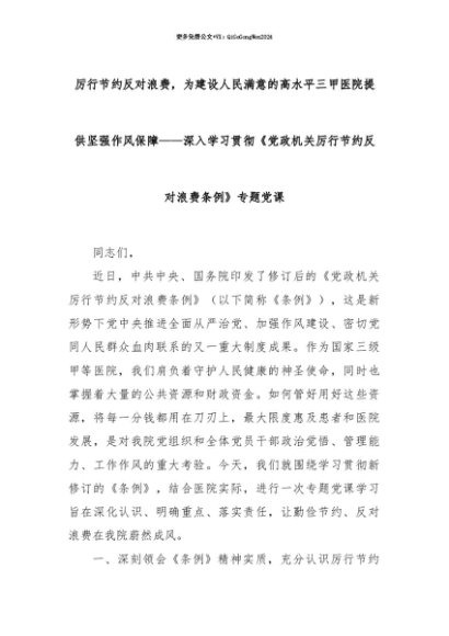 【七哥公文】2025年:【七哥公文】厉行节约反对浪费,为建设人民满意的高水平三甲医院提供坚强作风保障——深入学习贯彻《党政机关厉行节约反对浪费条例》专题党课+更多免费公文+VX:QiGeGongWen2024+更多免费公文+VX:QiGeGongWen2024