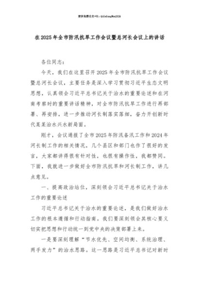 【七哥公文】2025年:【七哥公文】在2025年全市防汛抗旱工作会议暨总河长会议上的讲话+更多免费公文+VX:QiGeGongWen2024+更多免费公文+VX:QiGeGongWen2024