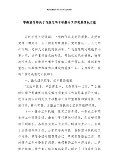 【七哥公文】2025年:【七哥公文】市委宣传部关于违规吃喝专项整治工作进展情况汇报+更多免费公文+VX:QiGeGongWen2024+更多免费公文+VX:QiGeGongWen2024