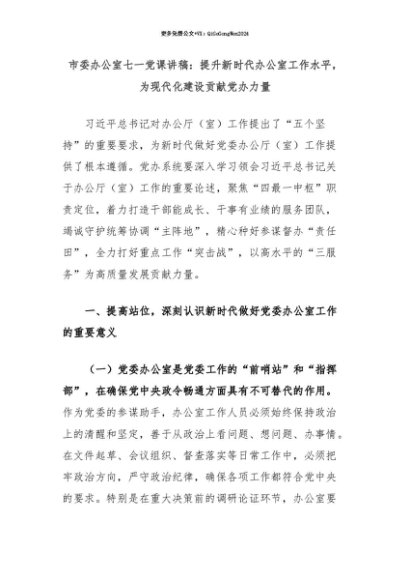 【七哥公文】2025年:【七哥公文】市委办公室七一党课讲稿:提升新时代办公室工作水平,为现代化建设贡献党办力量+更多免费公文+VX:QiGeGongWen2024+更多免费公文+VX:QiGeGongWen2024