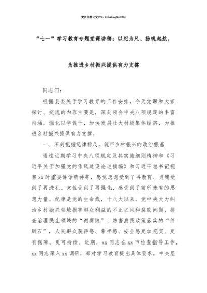 【七哥公文】2025年:【七哥公文】“七一”学习教育专题党课讲稿:以纪为尺、扬帆起航,为推进乡村振兴提供有力支撑+更多免费公文+VX:QiGeGongWen2024+更多免费公文+VX:QiGeGongWen2024