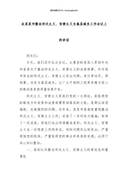 【七哥公文】2025年:【七哥公文】在某某市整治形式主义、官僚主义为基层减负工作会议上的讲话+更多免费公文+VX:QiGeGongWen2024+更多免费公文+VX:QiGeGongWen2024