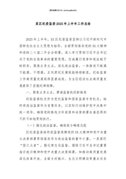 【七哥公文】2025年:【七哥公文】某区纪委监委2025年上半年工作总结+更多免费公文+VX:QiGeGongWen2024+更多免费公文+VX:QiGeGongWen2024