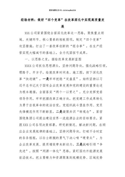 【七哥公文】2025年:【七哥公文】经验材料:做好“四个变革”在改革深化中实现高质量发展+更多免费公文+VX:QiGeGongWen2024+更多免费公文+VX:QiGeGongWen2024