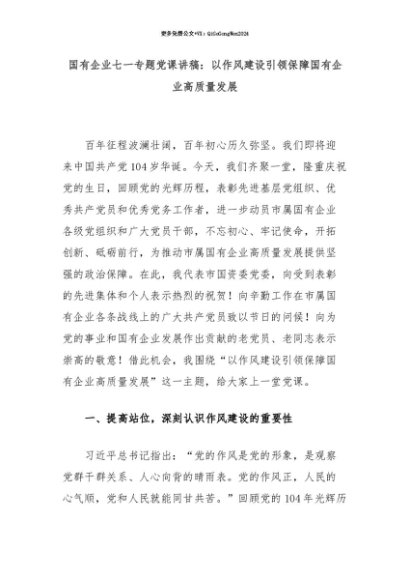 【七哥公文】2025年:【七哥公文】国有企业七一专题党课讲稿:以作风建设引领保障国有企业高质量发展+更多免费公文+VX:QiGeGongWen2024+更多免费公文+VX:QiGeGongWen2024