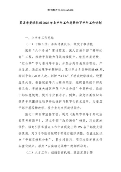 【七哥公文】2025年:【七哥公文】某某市委组织部2025年上半年工作总结和下半年工作计划+更多免费公文+VX:QiGeGongWen2024+更多免费公文+VX:QiGeGongWen2024