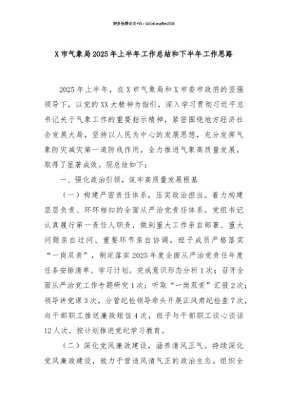 【七哥公文】2025年:【七哥公文】X市气象局2025年上半年工作总结和下半年工作思路+更多免费公文+VX:QiGeGongWen2024+更多免费公文+VX:QiGeGongWen2024