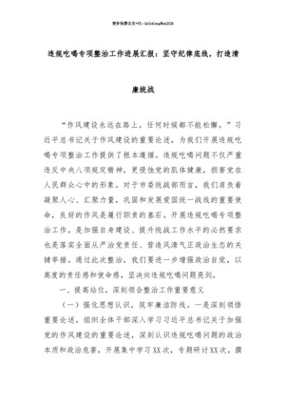 【七哥公文】2025年:【七哥公文】违规吃喝专项整治工作进展汇报:坚守纪律底线,打造清廉统战+更多免费公文+VX:QiGeGongWen2024+更多免费公文+VX:QiGeGongWen2024