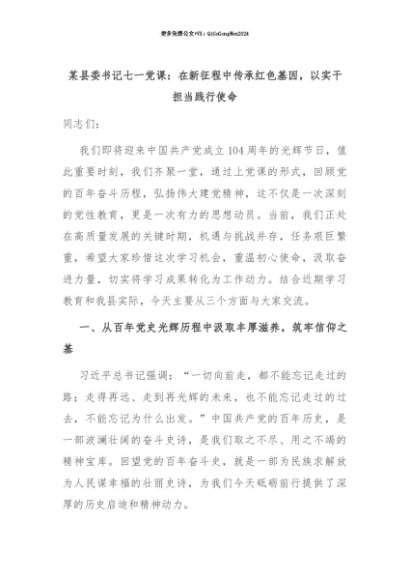 【七哥公文】2025年:【七哥公文】某县委书记七一党课:在新征程中传承红色基因,以实干担当践行使命+更多免费公文+VX:QiGeGongWen2024+更多免费公文+VX:QiGeGongWen2024