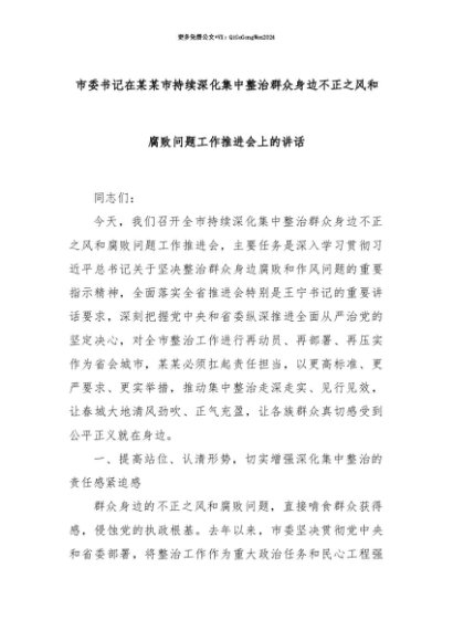 【七哥公文】2025年:【七哥公文】市委书记在某某市持续深化集中整治群众身边不正之风和腐败问题工作推进会上的讲话+更多免费公文+VX:QiGeGongWen2024+更多免费公文+VX:QiGeGongWen2024