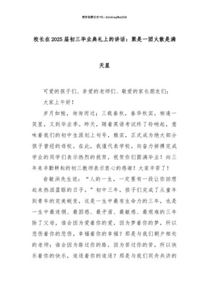 【七哥公文】2025年:【七哥公文】校长在2025届初三毕业典礼上的讲话:聚是一团火散是满天星+更多免费公文+VX:QiGeGongWen2024+更多免费公文+VX:QiGeGongWen2024