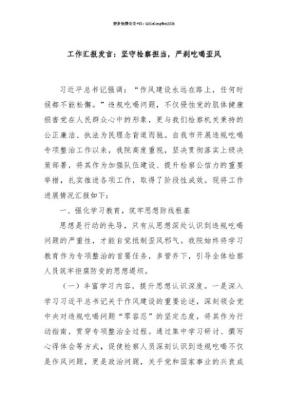 【七哥公文】2025年:【七哥公文】工作汇报发言:坚守检察担当,严刹吃喝歪风+更多免费公文+VX:QiGeGongWen2024+更多免费公文+VX:QiGeGongWen2024